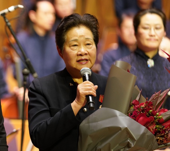 音乐会最后,“大地妈妈”易解放和时代楷模钟扬的妻子张晓艳上台接受观众的致意和献花。易解放说:“我只是一个平凡的母亲,刚才视频把我和精卫联系在一起,其实我是比精卫幸福的,因为精卫是孤独的,只有一人填海,而我有很多很多志愿者跟我一起,我相信当我们一起齐心协力,终有一天把沙漠变成绿洲!”