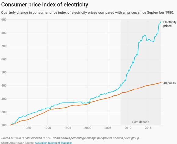 而且澳洲的电费一直在涨。从下图可以看出,2008年以前的电费涨幅还跟CPI相当,但2008年以后就可以用火箭来形容了,10年间涨了117%,是CPI的4倍。