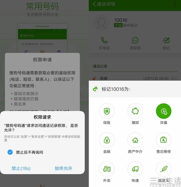 与很多的国内的APP相似,搜狗号码在安装之后所需要的权限极多,除了电话、通讯录、短信之外,还有定位、相机、麦克风等等。而在最关键的号码标记上,这款APP的审核约等于0,既不需要用户登录APP才能开启相应的标记功能,并且对于标记对象的资质,看起来也并没有判断。