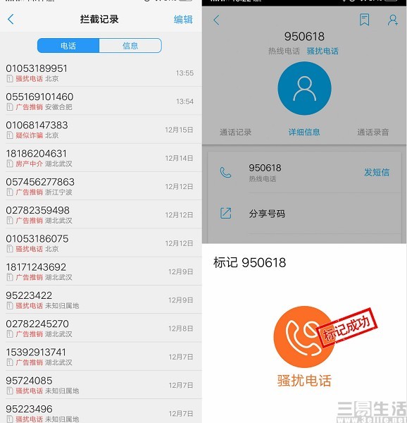 而在另一个APP触宝电话的测试中,与搜狗号码通一样,这款APP在标记电话号码上同样相当“便捷”,点击页面上的“标记”按钮,我们很轻松的就将950618(京东客服热线)标记为骚扰电话。但需要注意的是,不同于搜狗电话通,触宝电话不仅遍布广告,同时还没有提供明确的申诉和认证渠道。