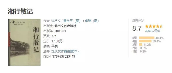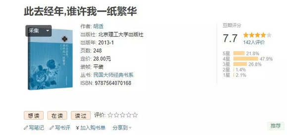 其实,这套名为《那些路过心上的经典:民国大师经典书系》(套装共9册)的图书,早在2013年由北京某大学出版社出版。现在某电商网站,这套书仍然可以买到,参与评价的读者近3万人次,99%的人打出了好评。在豆瓣上,这套丛书的评分也不低,如胡适的《此去经年,谁许我一纸繁华》有7.6分,沈从文的《一指流沙,我们都握不住的那段年华》为8.0分,评分最高的是梁实秋翻译的《陌上谁人依旧,固守流年》8.4分。