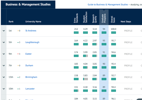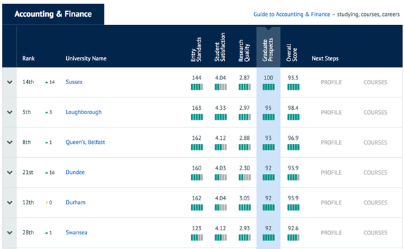这样的就业支持大大增加了学生的竞争力,也难怪在2019年Complete University Guide就业前景排行榜中,拉夫堡大学商学院的排名比一些罗素联盟的成员大学还要高呢。(如下图所示,在2019年Complete University Guide排名中,拉夫堡大学商学院就业前景在“商业与管理学”、“会计与金融”这两个细分领域都排名全英第二)