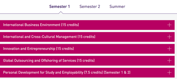 以拉夫堡大学商学院的MSc International Business专业为例。如下图所示,第一学期主要以理论课程为主,从商业、跨文化、创新等方面帮助学生形成一个完善的知识体系