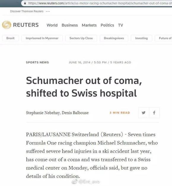 “舒马赫并不是沉睡了五年然后苏醒的。实际上他2014年6月16日就醒了(路透社报道),只昏迷了半年。”