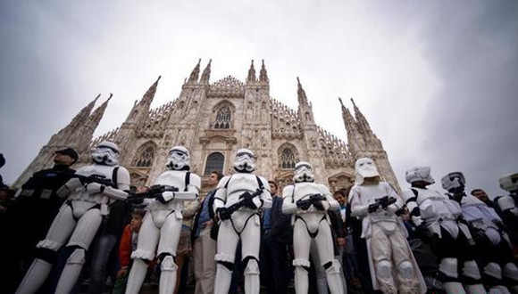电影《星球大战》系列有一句经典台词:“May the force be with you”,跟“May the Fourth be with you”发音相近,因此5月4日被粉丝定为“星球大战日”。星战粉丝齐聚意大利米兰, 用他们的方式庆祝星球大战日。各地的星战爱好者们想出的各种各样的乐子简直就是创意大比拼。
