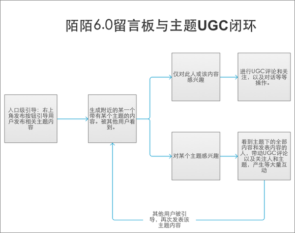 其次重要的是UGC内容的刺激层面,留言板和主题打的配合战,陌陌通过右上角的发布留言内容来引导用户发送相关主题内容,这些内容将会出现在留言板这一模块中并且附带主题引导链接,这又会反过来引导对该主题感兴趣的其他用户去查看这个主题下的全部内容,而其他用户看到这些内容后则也可能去评论以及发布内容,这些内容发布后再次出现在附近的人当中,形成一个正向循环的UGC闭环。也就是说留言板这一模式把曾经孤立的陌陌吧这一模式彻底给打通了,之前的陌陌吧一直都是独立的模块。以下是这二者构成的UGC闭环逻辑。