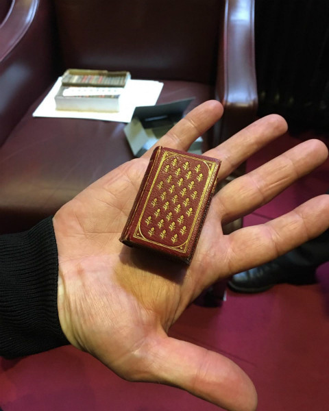 与《神曲》一起存放的,还有一本世界上最小的钦定本圣经,它于1896年由英国格拉斯哥的大卫·布莱斯(David Bryce)首次印刷。布莱斯说当“他看到这本书过分微小的尺寸”,他对这个产物的荒谬性产生了极大的嘲讽。这个版本的《圣经》横竖不过1英寸,在它封面的小口袋里放着一个小放大镜(《神曲》与此不同之处在于,《神曲》虽小,但字迹清晰可辨,但该《圣经》不借助放大镜是读不了的)。此外,还有一本微型书是19世界80年代的凯特·格林纳威(Kate Greenaway)的《字母表》(Alphabet),照看图书馆藏品的杜尼娅·加西亚·奥蒂弗罗斯(Dunia Garcia-Ontiveros)给我看了1828年版的古罗马诗人贺拉斯的诗集,并说这是用Henri Didot小字体印刷的第二本书。在展示精湛做工的同时,书的正文还包含了许多装饰性的话语,其中心是由字母“Henri Didot”构成的,这些字母的印刷字体甚至比正文的字体还要小。我翻阅页面试图找到它们,最后,通过手机上的放大功能,我找到了。