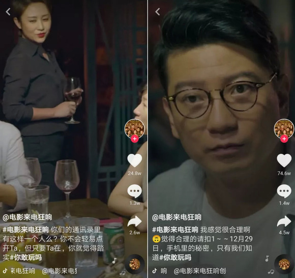 从《来电狂响》在抖音发布的具体视频来看,“手机里的秘密只有我们知道#你敢玩吗”这样数据可观的视频主要是在“来电”这一电影标题上做文章,结合电影中的片段发起传播。