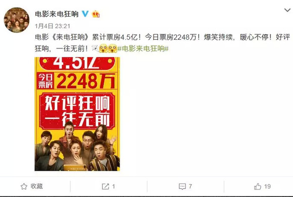 例如《来电狂响》官方号新浪微博粉丝约1万2,多数微博转发评论基本都是个位数;年度爆款《西虹市首富》官方号同样数据极冷。在主演们的个人微博上,则是一派火热场景。