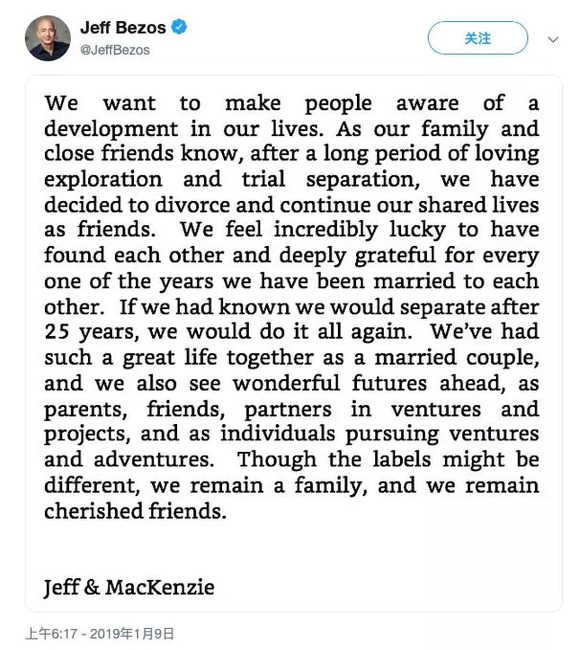 声明之后,劳燕纷飞。2018年刚刚成为世界首富的贝佐斯,在亚马逊成为全球市值最大公司的第一天宣布离婚。