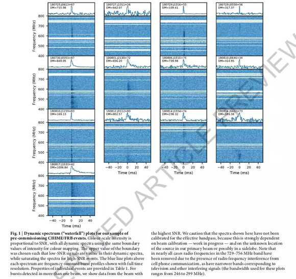 加拿大一组叫 CHIME 的射电望远镜,从去年开始已经探测到 13 组深空电磁波信号。这种信号有点特殊,跟我们平时探测到的脉冲星信号啥的不太一样,这组被探测到的信号名叫 FRB ( Fast radio burst ),“快速无线电爆发”。