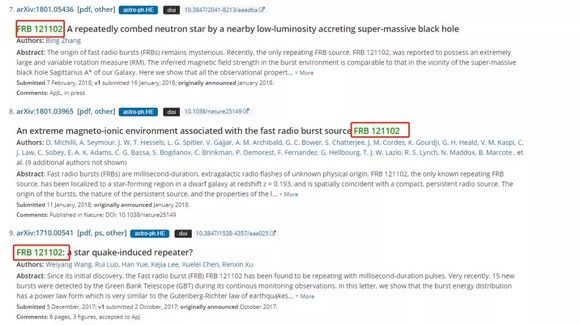 曾经也有编号为 FRB 121102 的一组 FRB 波被重复探测到,这组信号源全部来自与 30 亿光年的某一个星空深处。当时大家各种探讨,头皮都快抓破了,要知道,这么大能量的信号,随机重复出现,从同一个地方射过来。。。