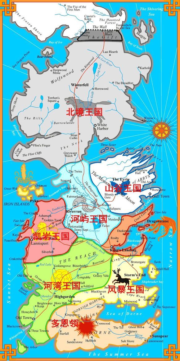 两幅图对比看,就可以一一对应七大王国与九大家族的地理位置: