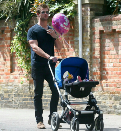克里斯·海姆斯沃斯在5月10日被看到在伦敦大街上带着14个月的儿子在散步。