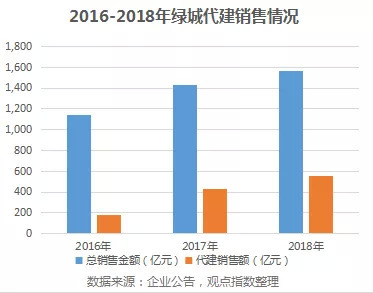 年报数据显示,在2016年绿城踏入千亿时,代建就是不可或缺的部分。2016年-2018年三年,代建分别为绿城的业务贡献了181亿、431亿和552亿,所占的比例由2016年的16%到2018年的35%,若剔除代建部分的销售,2018年绿城物业销售的合同销售金额仅为1012亿元。