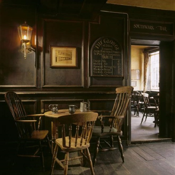 有些酒吧不仅仅与作家同名,也曾与他们共同见证历史,最突出的例子是乔治酒馆(George Inn),它是伦敦仅存的驿马客栈,目前由英国国民信托拥有并出租。乔治酒馆建在乔叟《坎特伯雷故事集》的起点“战袍”酒馆(The Tabard)旁,因为莎士比亚和后来的狄更斯经常光顾而出名。狄更斯除了在小说《小杜丽》中提到该酒馆,据说还因为听闻莎士比亚是常客而开始经常光顾此地。为了获取灵感,很多心有抱负的作家都曾在此流连,这是一个带着酒味的文学传统。