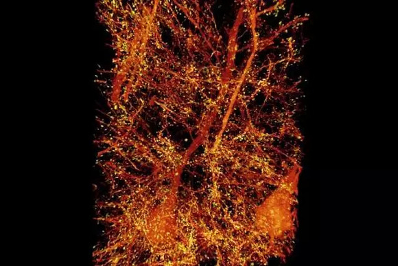 小鼠初级躯体感觉皮层中的锥体神经元(橙色部分),与突触后蛋白Homer1相关的树突棘用黄色突出显示。来源: MIT