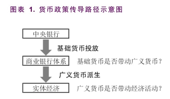 因为货币政策传导路径有两个环节,所以央行的货币扩张是否能带动实体经济中经济活动的活跃,就要看在两个节点上传导是否顺畅:其一,是央行的基础货币投放是否能带来商业银行体系广义货币的派生;其二,是商业银行广义货币的派生是否能够带来实体经济的活跃。如果在第一个节点衔接不顺畅,就可以认为基础货币投放碰到了流动性陷阱——更多的基础货币不能带来广义货币的相应扩张。而如果在第二个节点衔接不畅,就可以认为广义货币投放碰到了流动性陷阱——更多的广义货币无法刺激经济活动。(图表 1)