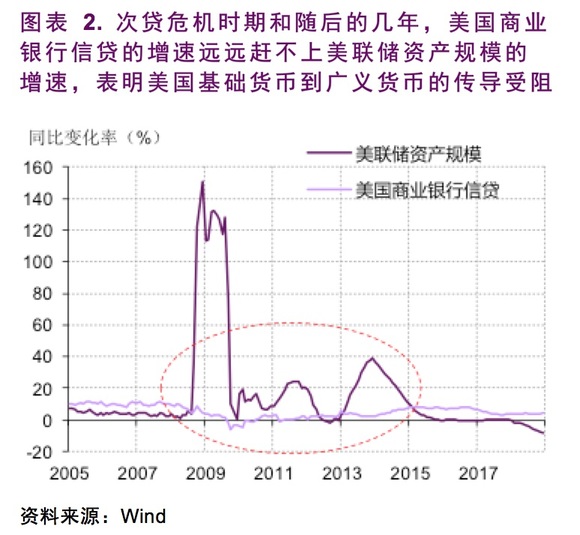 在凯恩斯时代,对货币政策的研究还远不如现在那么精细,货币政策传导路径也并不为人所重视。所以在凯恩斯的论述中并未区分前述的两个节点。在其《通论》中,凯恩斯更多是从利率下降到较低水平后,人们的流动性偏好变得极大来论述流动性陷阱的,对应的是前面所说的广义货币到经济活动的阻塞。而在当前的现实世界中,从基础货币到广义货币的传导更容易受阻。次贷危机爆发后的几年,美联储在基础货币到广义货币的传导上碰到了阻塞——商业银行的信贷增速却长期大幅低于美联储资产规模的增长,表明美联储的基础货币投放(伴随美联储资产的扩张)并未带动银行信贷的相应增长。可以说,这段时间的美联储碰到了流动性陷阱(图表 2)
