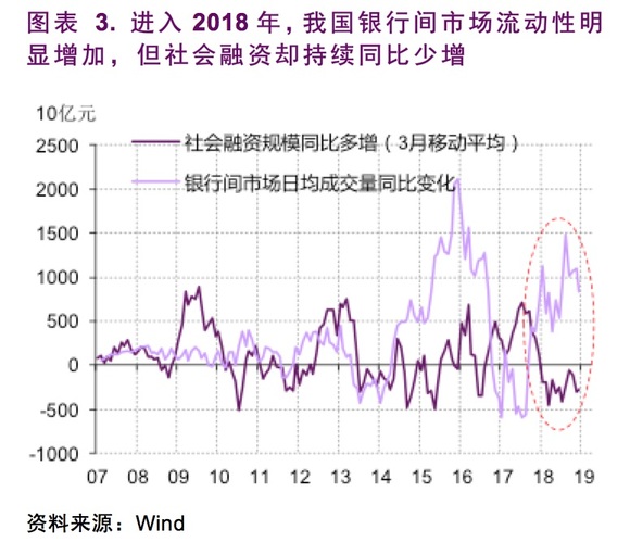 很显然,人民银行在2018年投放的基础货币并未带来广义货币的相应扩张。在从基础货币到广义货币的传导上,货币政策出现了阻塞。换言之,我国在这个节点上碰上了流动性陷阱。(图表 3)