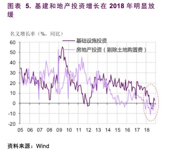 另一方面,是地方政府去杠杆政策和地产调控政策对实体经济融资需求的打压。基础设施投资和地产投资各占我国总投资的约1/4,合起来占据了投资的半壁江山。从2017年开始,在控制地方政府债务扩张的导向下,地方政府(通过地方政府融资平台进行)的融资在政策压力下明显走低。同时,地产开发商获得的融资支持也因为地产调控政策收紧而明显走弱。由于这二者是实体经济中最重要的两类融资需求主体,对其融资需求的政策性抑制使得金融机构向实体经济的融资投放变得困难。在这样的背景下,基础设施投资和地产投资的增速在2018年明显走低,成为我国经济增长下行压力的重要来源。(图表 5)