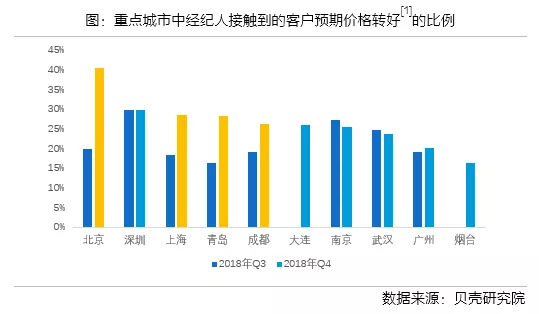 从城市来看,北京、上海、青岛和成都客户观望态度较三季度明显缓和,经纪人接触的客户中担心价格上涨以及不会再跌的占比明显升高。以北京为例,去年12月北京二手房市场交易量和客户带看量开始筑底回升,客户的带看成交效率有所提升。