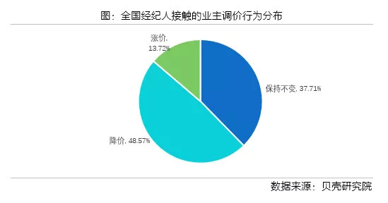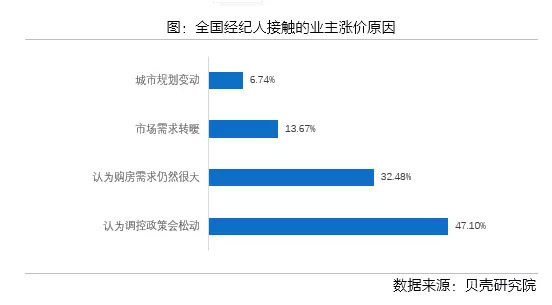 从业主端来看,调控政策的松动以及认为需求较大是业主涨价的主因。2018年四季度全国经纪人接触的业主是因预期政策松动和认为购房需求依然很大而涨价的经纪人占比分别47.1%和32.5%。