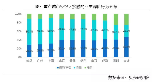 重点城市中,武汉、广州和上海业主降价行为较多,占比在60%左右。而深圳、大连和成都业主调价中稳定占比较高,三城的均价近期也出现了止跌迹象。