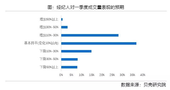 交易量方面,全国有37%的经纪人认为一季度成交量将环比持平,28%的经纪人预计比上季度增长10%-30%。31%的经纪人认为一季度成交量将会下降,认为交易量下降的比例比上季度下降29个百分点。