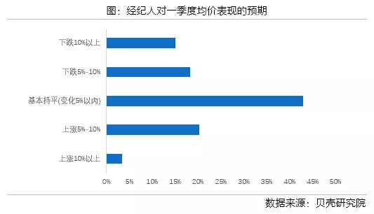 价格方面,有43%的经纪人认为一季度价格将环比持平,20%的经纪人预期价格会有小幅上涨。而认为一季度均价将会下跌的经纪人为23.7%,该比例较四季度减少36.7个百分点。
