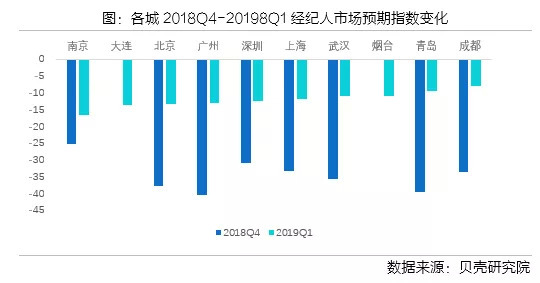 贝壳研究院2019年第一季度全国职业经纪人预期调研结果显示,经纪人整体市场预期的预期指数由-35.8上升到-12.8,经纪人悲观预期程度明显减弱,这预示着未来短期市场筑底回升的可能性在上升。