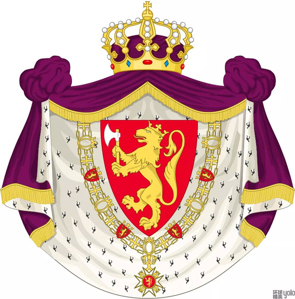 挪威,意为“通往北方的路”,挪威是君主立宪制国家,拥有世代沿袭的王族制度,王室的对外形象总是备受挪威国民以及世界人民的关注。盾徽上端是一顶镶嵌着圆球和十字的金色王冠。它最初于13世纪出现在哈康国王祖先斯瓦莱国王的旗帜与徽章上。盾徽中雄狮前肢紧握战斧的图案是8世纪以来神圣国王的个人象征。金色雄狮头上的王冠造形简朴,体现了斯堪的纳维亚地区金属制作的特有风格。盾徽顶端的王冠,象征王族的威严和至高无上的权力。