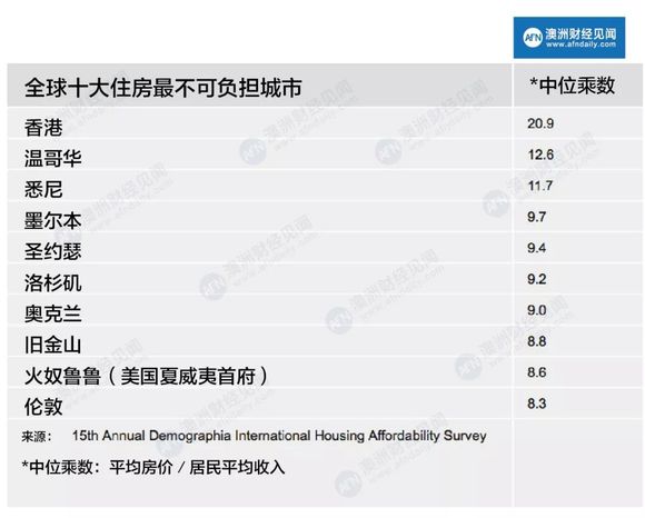 根据最新Demographia国际住房负担能力调查显示,继香港和温哥华之后,悉尼是世界上第3个住房严重不可负担的城市,墨尔本位居第4名。