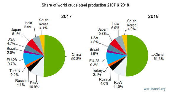 中国粗钢产量占全球粗钢产量的份额,由2017年50.3%上升到2018年的51.3%。
