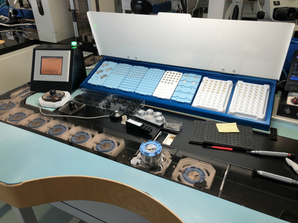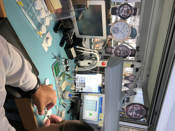 外面是量产机芯,也就是10万元以下的机芯组装,而里面有个小房间,这里是由专人负责的复杂机芯组装,不再是流水线,而是一个人从头到尾负责一枚腕表机芯的全部组装。