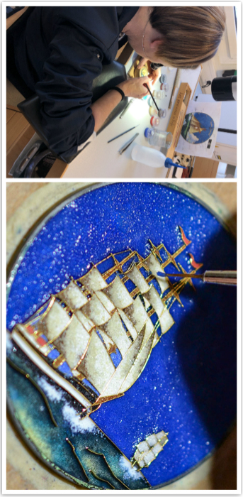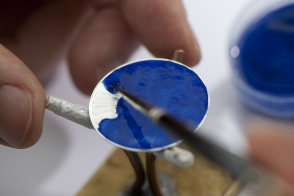 在此之后,另一位工匠才能用笔沾珐琅颜料涂入适当的区块,描摹出生动的图案。上料与烧制的工序亦要反覆数次才能达到所需厚度,最后进行表面抛光,除去多馀的珐琅与金线,才算是完成。