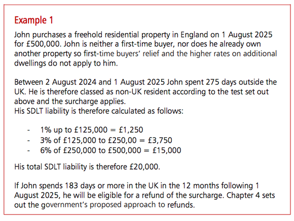 举例来说,假如约翰在2025年在英格兰购买了一套价值50万英镑的房产。在购房前一年内,约翰在英国境外待了275天,被纳入“外国买家”范围,所以此时他就需要按照新草案缴纳额外的海外买家印花税。