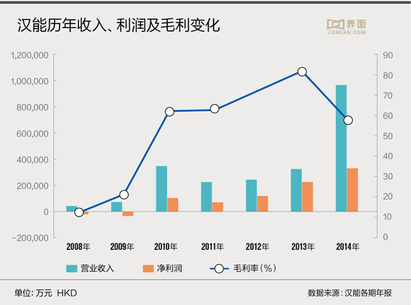 2015年3月30日,汉能公布了2014年年度业绩。报告显示,2014年公司实现营业收入96亿港元(约合76.83亿元人民币),比上年增长193%。净利润33亿港元(约合26.41亿元人民币),同比增长64%。其中,非关联交易产生的收入占集团总收入大幅提升至38%,当中主要为期内出售旗下5个光伏电站项目所得的收益所致。