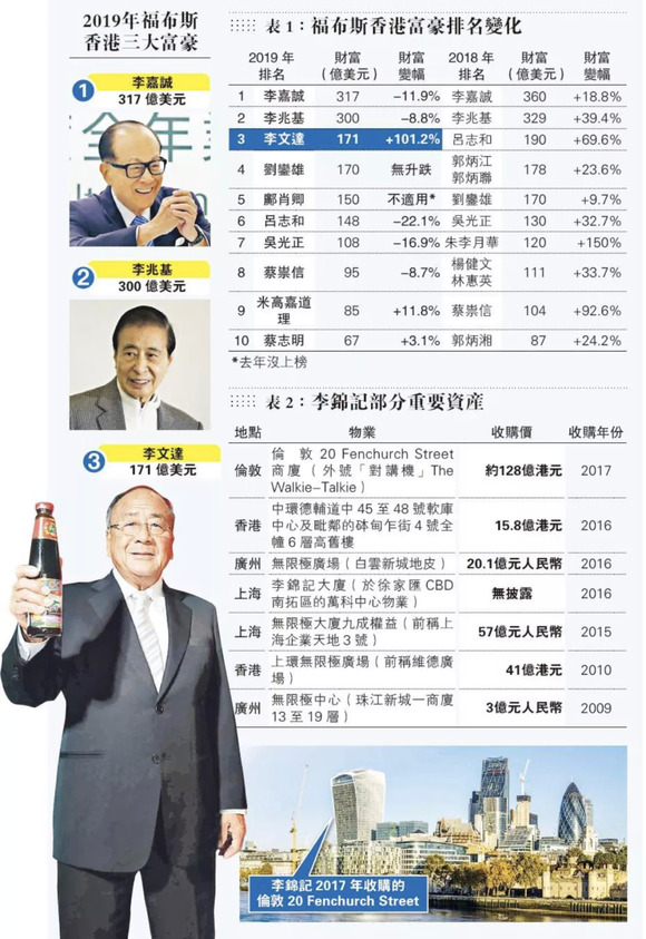 福布斯在2019年香港富豪榜中评论称,因不同领域在与不利情势抗争,该城市许多富人的资产都缩水了。那么,是什么让卖酱油的李锦记掌门人以“坐火箭”般的速度身家翻倍,并逆流而上至第三呢?