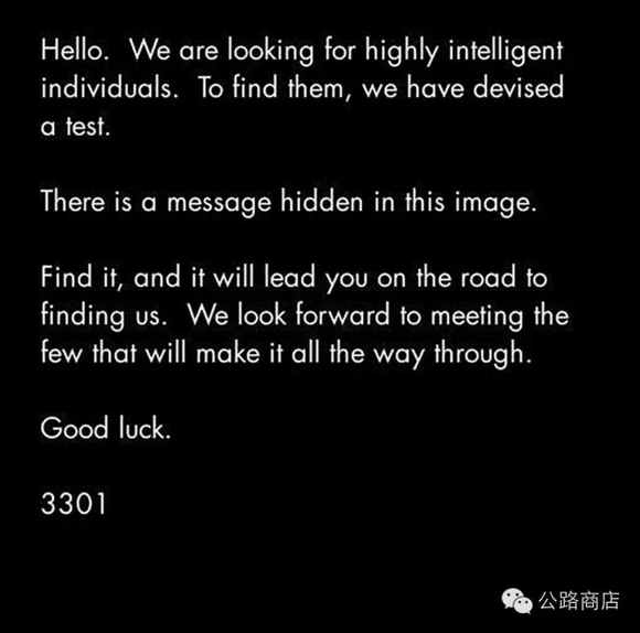 “你好:我们正在寻找高智能人士,为此我们设计了一项测验。这条信息里隐含着另一条信息,能找到隐含信息就能找到我们。我们盼望认识能做到这一点的极少数人。祝你好运。”