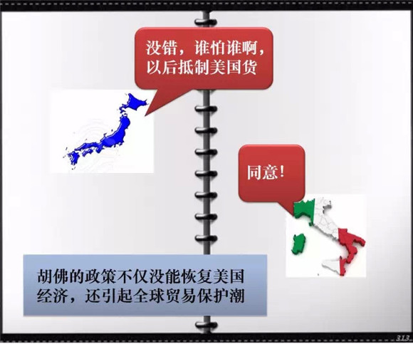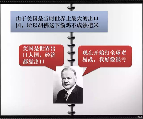 柯立芝的继任者胡佛一上任就迎来了经济危机, 但他坚信市场的自动调节作用,并提高关税,保护本国产业,结果挑起了全球贸易保护潮,整个资本主义经济都遭受了重大损失。