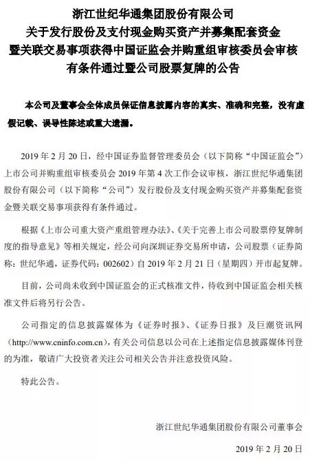 前天盘后,世纪华通发布了《关于发行股份及支付现金购买资产并募集配套资金暨关联交易事项获得中国证监会并购重组审核委员会审核有条件通过暨公司股票复牌的公告 》,内容包括重组案获通过的消息披露以及复牌时间等信息。