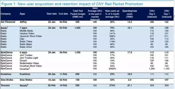 在德意志银行本月20日发布的报告中,我们看到:阿里系App在春节红包活动中增加的新用户约占过去3个月平均DAU的25%,百度系为78%;阿里系为26%、头条系为24%,快手为33%、微博为33%、腾讯微视为374%(需要说明说是:虽然微视的增长率更高,但其用户基数较小,只有200万左右,而其他App的DAU至少为1亿。)