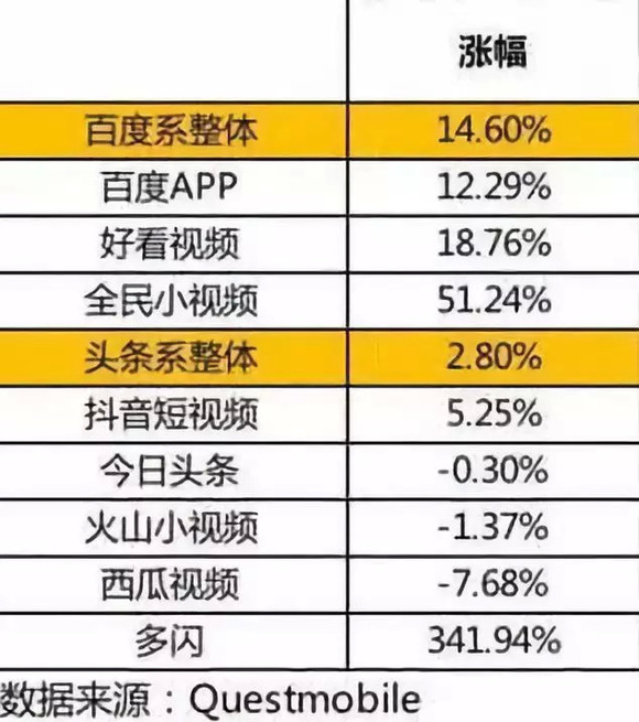 上述数据,同时也展示出了巨头们在春节档的不同增速步伐。在Questmobile数据中,我们看到:百度信息流主要产品——百度App在红包活动一周后日活用户增速达到了12.29%,好看视频增速达到了18.76%,全民小视频增速更是达到了51.24%。而作为对比的是做为头条系信息流三大产品的今日头条日活用户减少了0.30%、火山小视频日活用户数减少了1.37%,西瓜视频日活用户减少了7.68%。