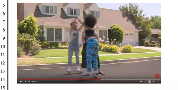 与此同时,Target在其YouTube频道一段15秒的品牌宣传片(截止目前该视频已无法观看)也被Vans作为指控其抄袭的重要依据。这段广告视频以滑板为主题,其中至少有一位模特脚上穿着Camella Lace Up进行滑板运动。Vans的律师对此表示:“Vans是一个历史悠久,与流行文化、街头文化和青年文化有着深厚渊源的品牌,Target对其产品的营销方式可以被看作是借用Vans良好的品牌声誉来迷惑年轻消费者,以达到提高其新产品销量的目的。”