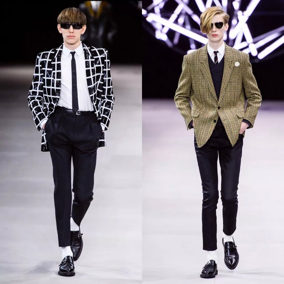 其实,关键是要穿“对”的西装。让我想到刚刚发布的Celine复古又潮流的西装——将post-streetwear概念(后现代街头服饰)与正装剪裁相融合,修身的款式上铺满了复古格纹、条纹,记得夜店小旋风的西装长这样。还有你的偏分头和长刘海不要飞起来,那是上个世纪的非主流。