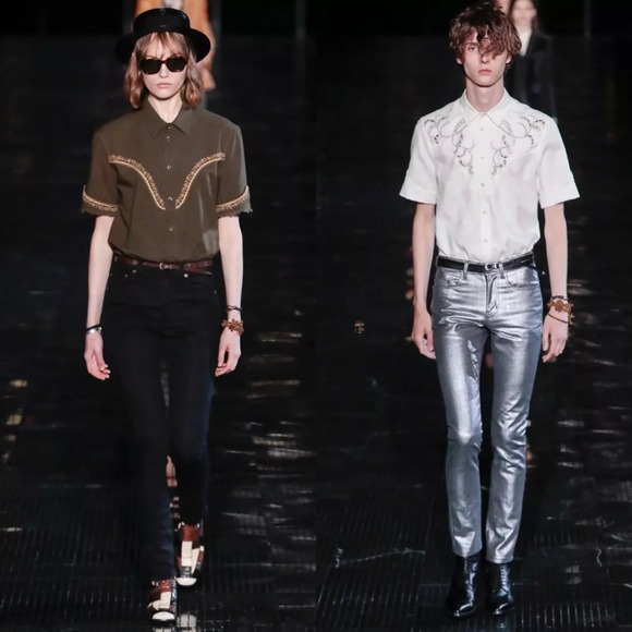 发自内心地想给前面穿小马甲、系领带的两位兄弟种草一下Saint Laurent衬衫。中的细节装饰短袖衬衫,精致的同时也为气质加分,更重要的是:蹦迪不会再大汗淋漓了。