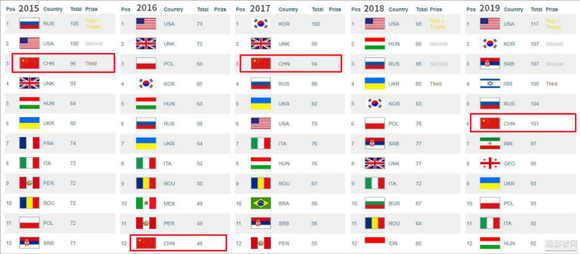 而且,从历年的数据可以看出,中国队在比赛中的成绩一直有起伏。