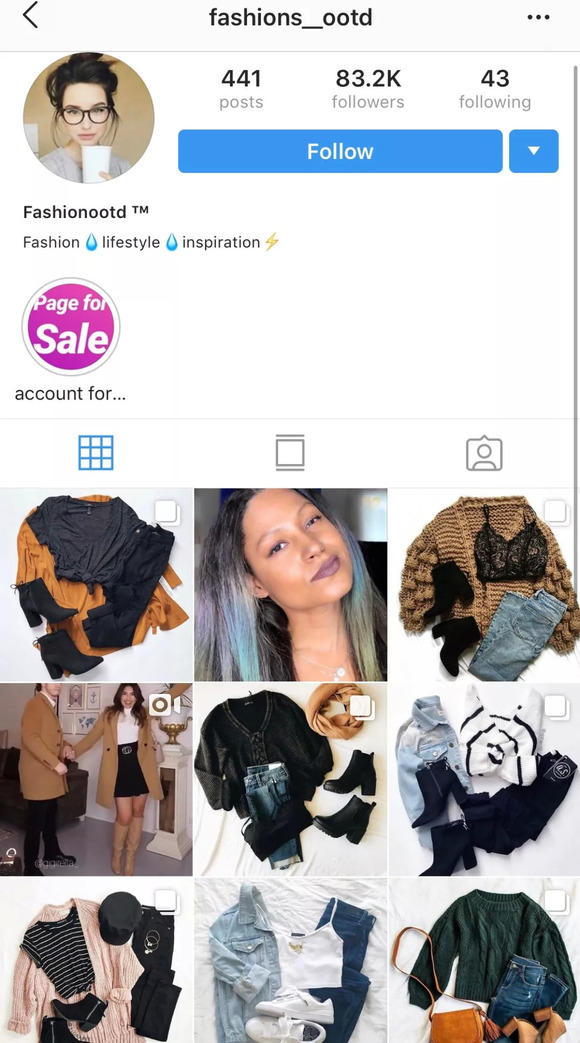 “这个搭配好看吗?”是Instagram上一个分享OOTD(今日穿搭)的账号fashions__ootd每次更新时的常用语,在这个账号上粉丝可以看到白色背景下发布的不同服饰搭配,作为互动账号会邀请粉丝点评每一次的搭配。同时,fashions__ootd发布的搭配还会为其中的每一双鞋、每一条牛仔裤打上hashtag(标签),用来增加浏览量。在Instagram上,经常会出现像这种围绕某一主题的小众账号,这类账号依靠发布某一类图片来获得一定的粉丝量。仔细观察fashions__ootd,你会看到一些不寻常的内容,在介绍中,这个拥有8万多粉丝的账号写着“该账号待售”。