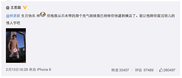 阔少真是躺着也中枪,当然也不能怪网友们的猜测。思聪本人就传过18禁的图片给他的好基友——林更新。